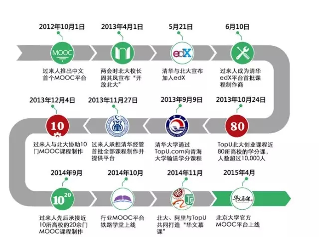 过来人在2012年的10月1号开始推出首个慕课平台,那个时候我们做的是比较早的,而且受到的质疑会非常多。这里面问的最多的一个问题就是,你怎么样作为一个民办教育机构去说服更多的大学愿意把自己的课程题给开放出来。然后在2013年5月份清华北大宣布加入edX,我们定义那一年是慕课真正的元年。因为在中国高等教育体制内,清华北大是处于一个相对来说比较超然的位置,大的政策支持只有他们来推动的话那成功的几率会大的许多。紧接着,我们看到清华2013年发布自己的学堂在线,后来Coursera吸引了上海交大、复旦的加入。在2014年,总体上来说,没有一些标志性的事情出来,更多的是执行层面。我们看到学堂在线的课程也是越来越多,整个中国慕课平台的发展也相对来说比较平缓。