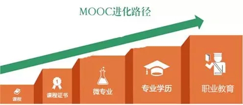 今天来看,慕课如果不论国家制度层面的影响,那慕课整个的发展基本上是被这张图给覆盖了。也就是从最早的课程开始,以及到课程证书(学分),到微专业,到专业学历,以及国务院参事汤敏老师去年开始倡导的“慕课最大的空间和机会实际上是在职业教育”。高等教育的改革既包括高学术教育也包括职业教育。