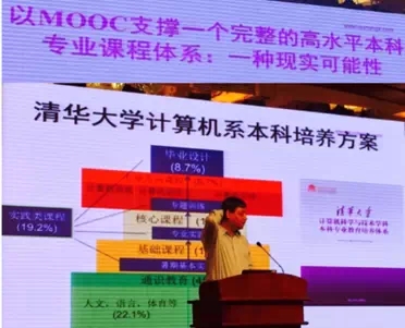 清华大学计算机系的系主任孙老师分享的主题是“以慕课支撑一个完整的高水平本科专业课程体系:一种现实可能性”。他拿出清华大学本科生的整个教学培养体系,然后一一去找向对应的课程对应。后来发现,目前为止95%以上的课程都可以找到慕课课程去对应。某种意义上意味着,清华大学计算机系本科的学生整个完整的教学现在就可以通过慕课的平台去实现。从这个角度来讲,计算机专业只是一个开始,相信随着慕课课程的完善,这里面最终影响的可不仅仅是计算机专业的学生,也不仅仅是高校自己,甚至其他的院校、其他的机构都会受到一定的影响,这个影响有可能我们今天都无法想象。