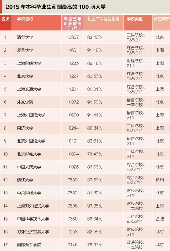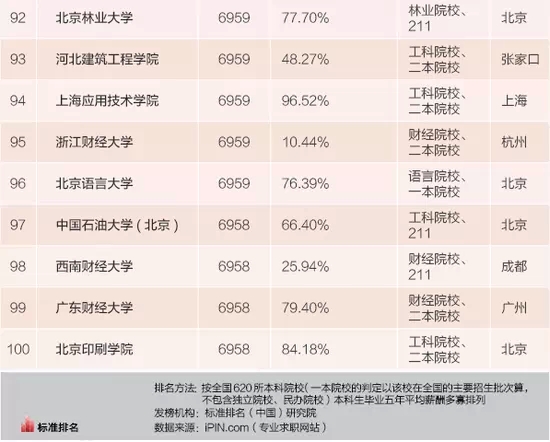 想知道你的同学们毕业五年之后大概都是什么收入水平吗?想知道报考什么样的大学毕业后才能拿到高薪么?标准排名(中国)研究院基于专业求职网站iPIN.com上全国620所本科院校的数据,制作了《2015中国高校毕业生薪酬排行榜》,找出了本科毕业生薪水最高的100所大学(“百强榜”)。