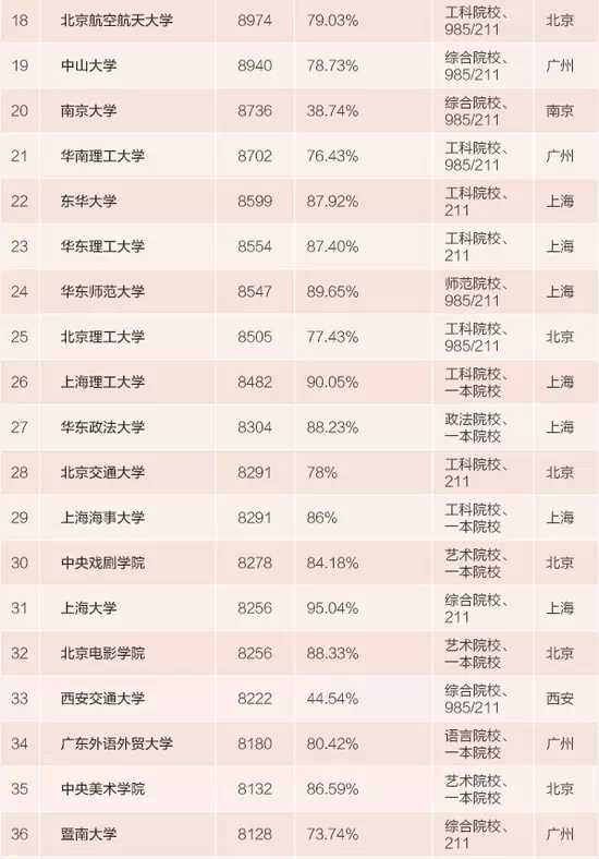 实在不行,要想高薪还能靠所学专业取胜。上榜的100强大学中,除却大学所在地和大学的级别类型,工科、财经、语言、艺术等专业性传统强校也是想毕业后拿高薪报考大学选择的重点之一。100强中,有11所财经院校、7所语言院校、5所艺术院校,这些专业性传统强校中绝大部分并非985或211大学,但都属于这个学科中的佼佼者。