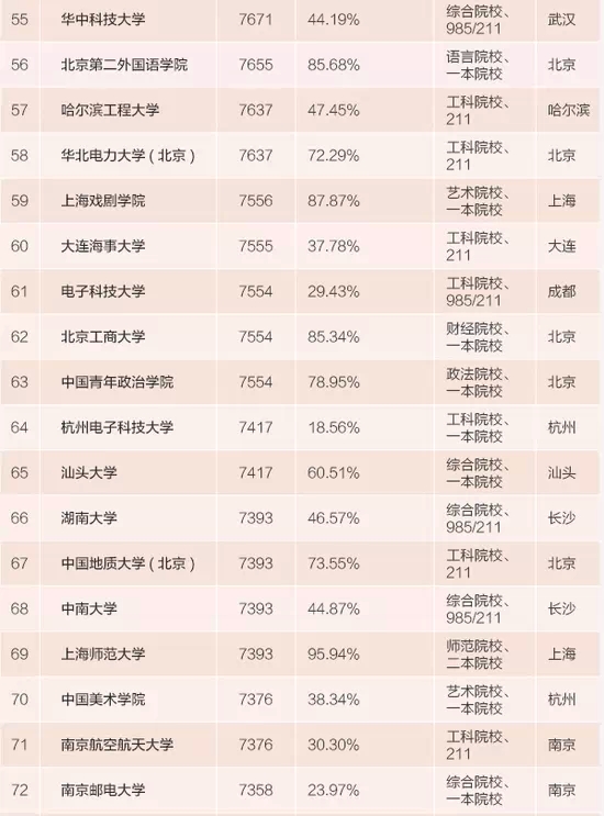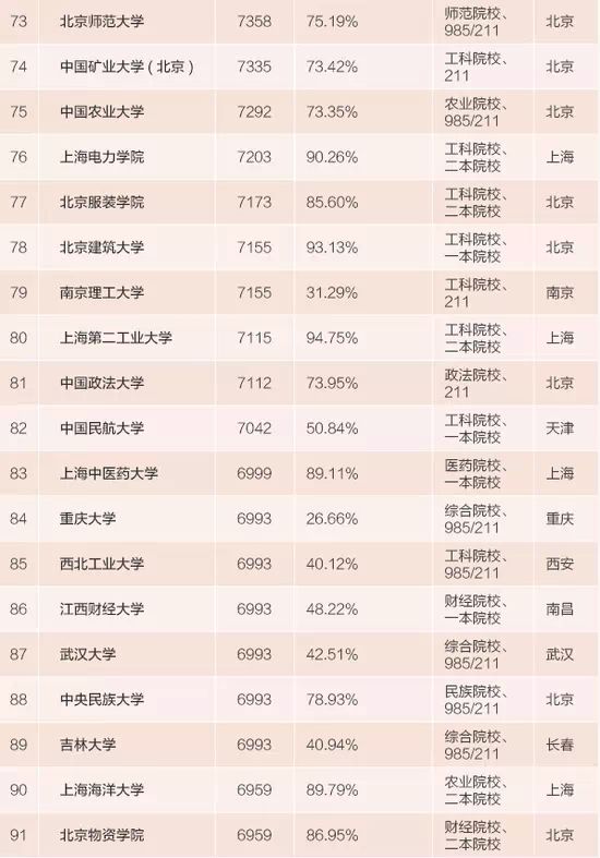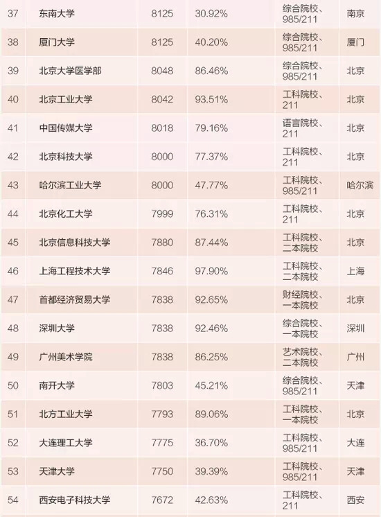 一共有20个城市的100所大学上榜,68所大学位于北上广深等一线城市,其中北京高校有40所、上海21所、广州6所、深圳1所。另外还有南京、杭州、天津、西安、武汉、成都、大连、哈尔滨、长沙、合肥、重庆、厦门、汕头、南昌、长春和张家口的大学上榜。百强大学中毕业生就业地基本都在北上广深,只有29所大学的一线城市就业率低于50%。
