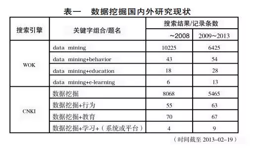数据挖掘技术进入教育领域相对较晚,研究人员的兴趣主要集中在开发研究与分析教育情境下的海量数据的技术工具,如数据挖掘帮助提升高校学生的记忆力(Zhang et al.,2010)、数据挖掘在基础教育课程评估中的应用(Hung et al.,2012),而基于e-learning的数据挖掘研究则是近年来的研究前沿。譬如,在e-learning系统应用数据挖掘,协助学生完成个性化学习(Sun & Xie,2009)、改善自适应学习的效用(Chellatamilan et al.,2011)、提升学生的学习绩效(Banu & Ravanan,2012)、研究学生行为和认知风格(Jovanovic et al.,2012)。