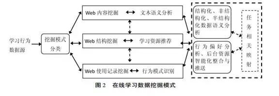 上述挖掘模式将在线学习行为可能产生的数据进行归类。随着应用目的变化,各种模式的研究和发展都在不断深化,如何将三种模式有效结合进而达到最优的分析结果是我们当前正在探究的课题,由于结构关系分析中需要涉及行为理论的表达与理解,从而影响任务相关性映射,因此如何进行自底向上的特征提取与关联分析,其中有许多机理有待进一步研究。