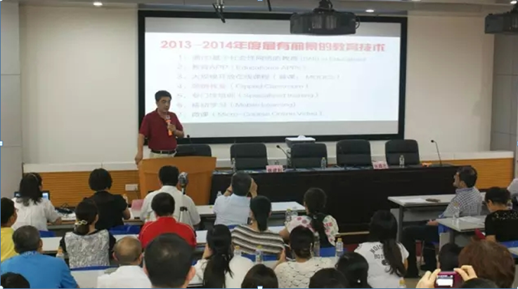课题组组长、华南师范大学教育技术学院副院长焦建利教授以“微课与翻转课堂发展趋势”为主题,结合课例与心得,用轻松有趣、贴近生活的语言,对翻转课堂进行深入分析交流,并对现场老师的问题给予解答,得到与会人员的一致好评与高度赞赏。